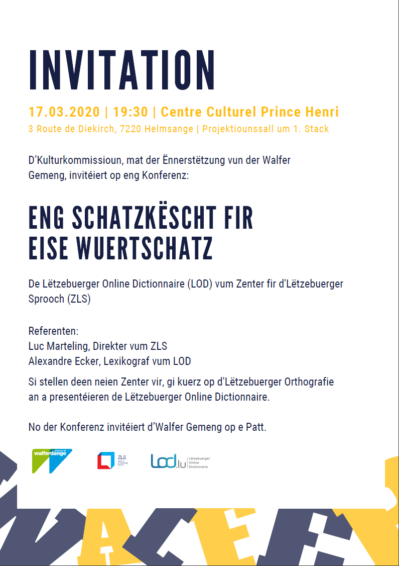D’Kulturkommissioun, mat der Ënnerstëtzung vun der Walfer Gemeng, invitéiert op eng Konferenz iwwer de Lëtzebuerger Online Dictionnaire (LOD) vum Zenter fir d'Lëtzebuerger Sprooch (ZLS). Et schwätzen de Luc Marteling, Direkter vum ZLS, an den Alexandre Ecker, Lexikograf vum LOD. Si stellen deen neien Zenter vir, gi kuerz op d’Lëtzebuerger Orthografie an a presentéieren de Lëtzebuerger Online Dictionnaire.