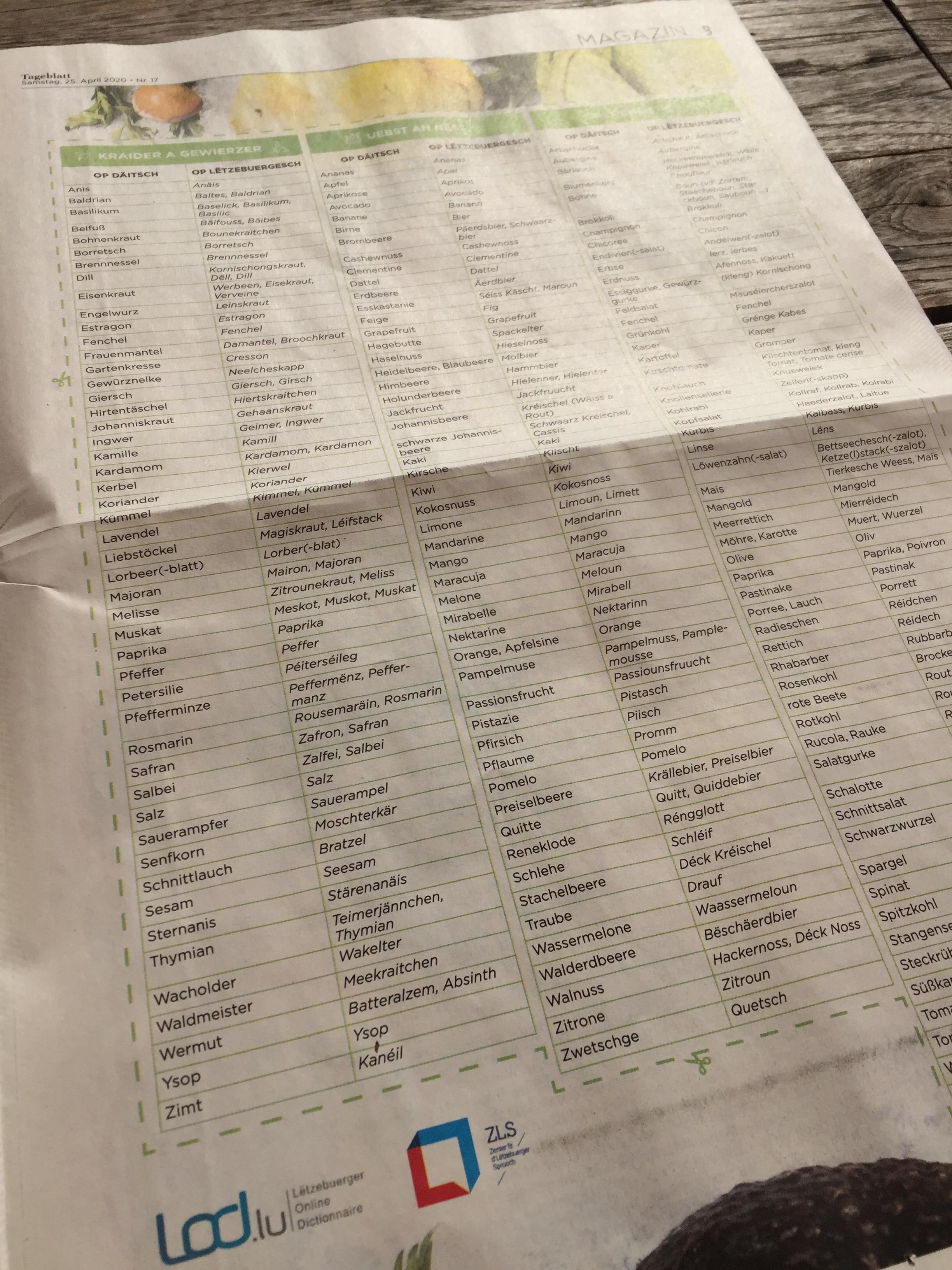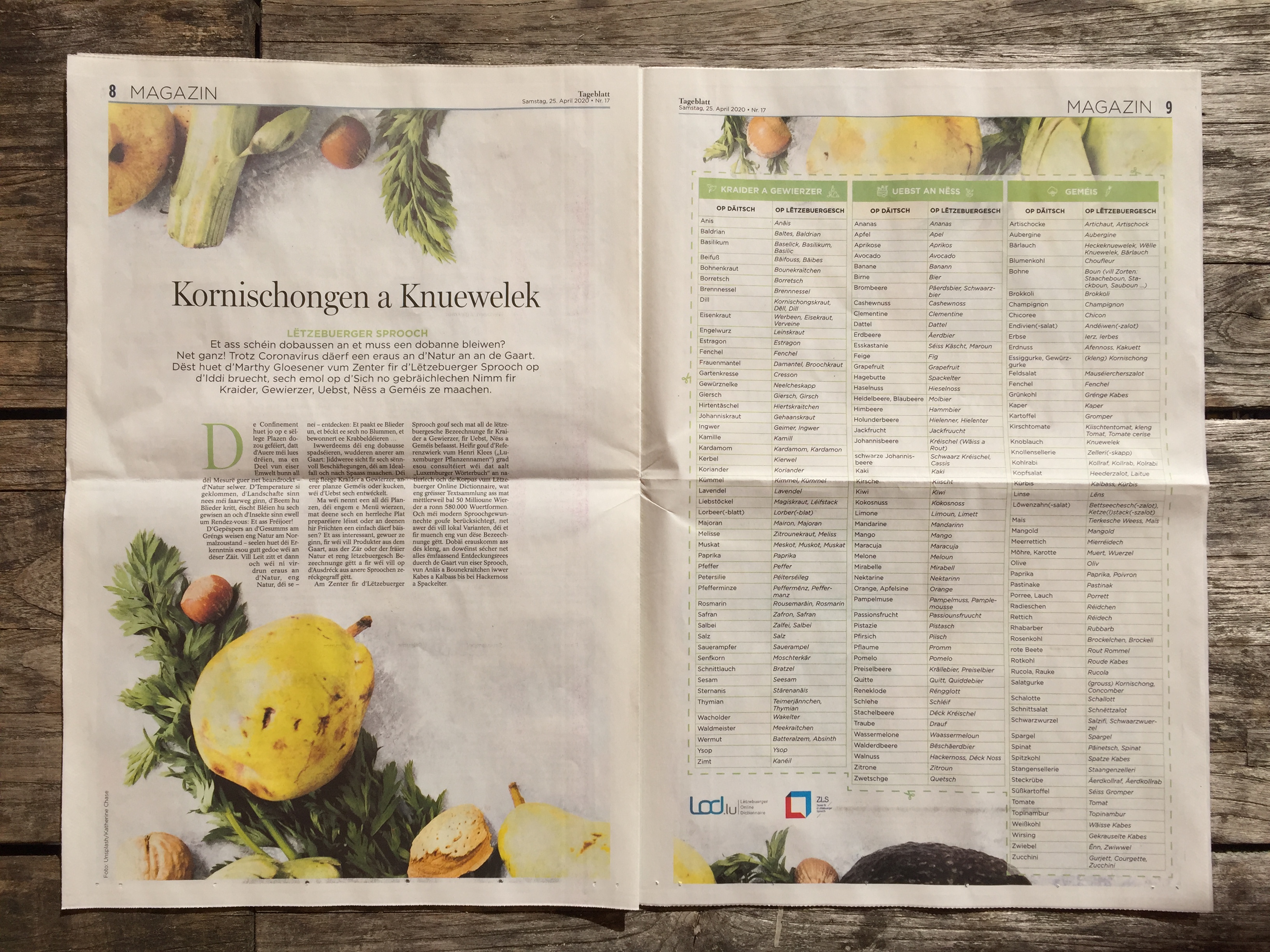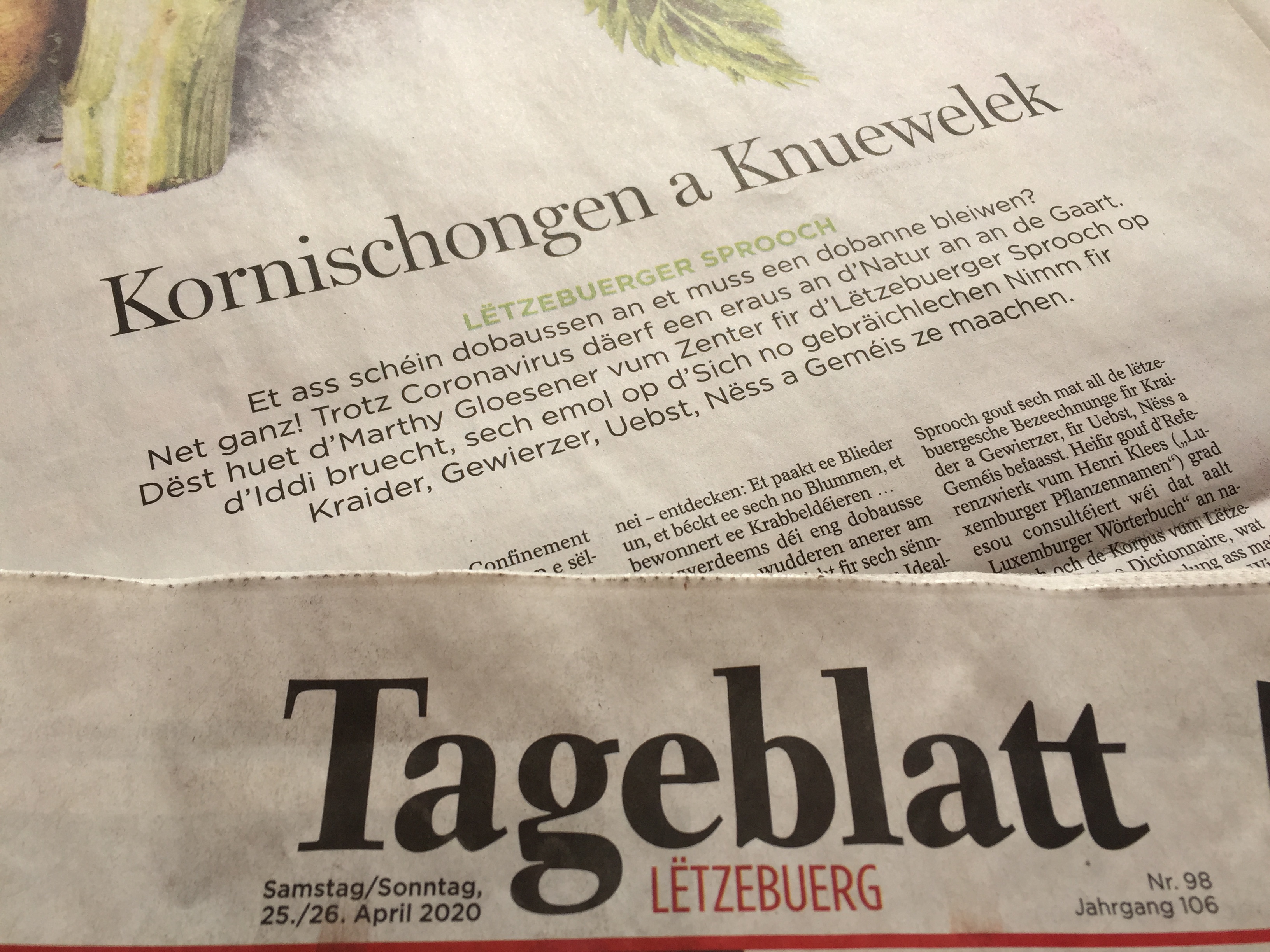 „Kornischongen a Knuewelek“ housch et de 25. Abrëll. Trotz Coronavirus duerf ee jo eraus an dʼNatur an an de Gaart. Dëst huet d’Marthy Gloesener vum Zenter fir dʼLëtzebuerger Sprooch op d’Iddi bruecht, sech emol op d’Sich no gebräichlechen Nimm fir Kraider, Gewierzer, Uebst, Nëss a Geméis ze maachen.