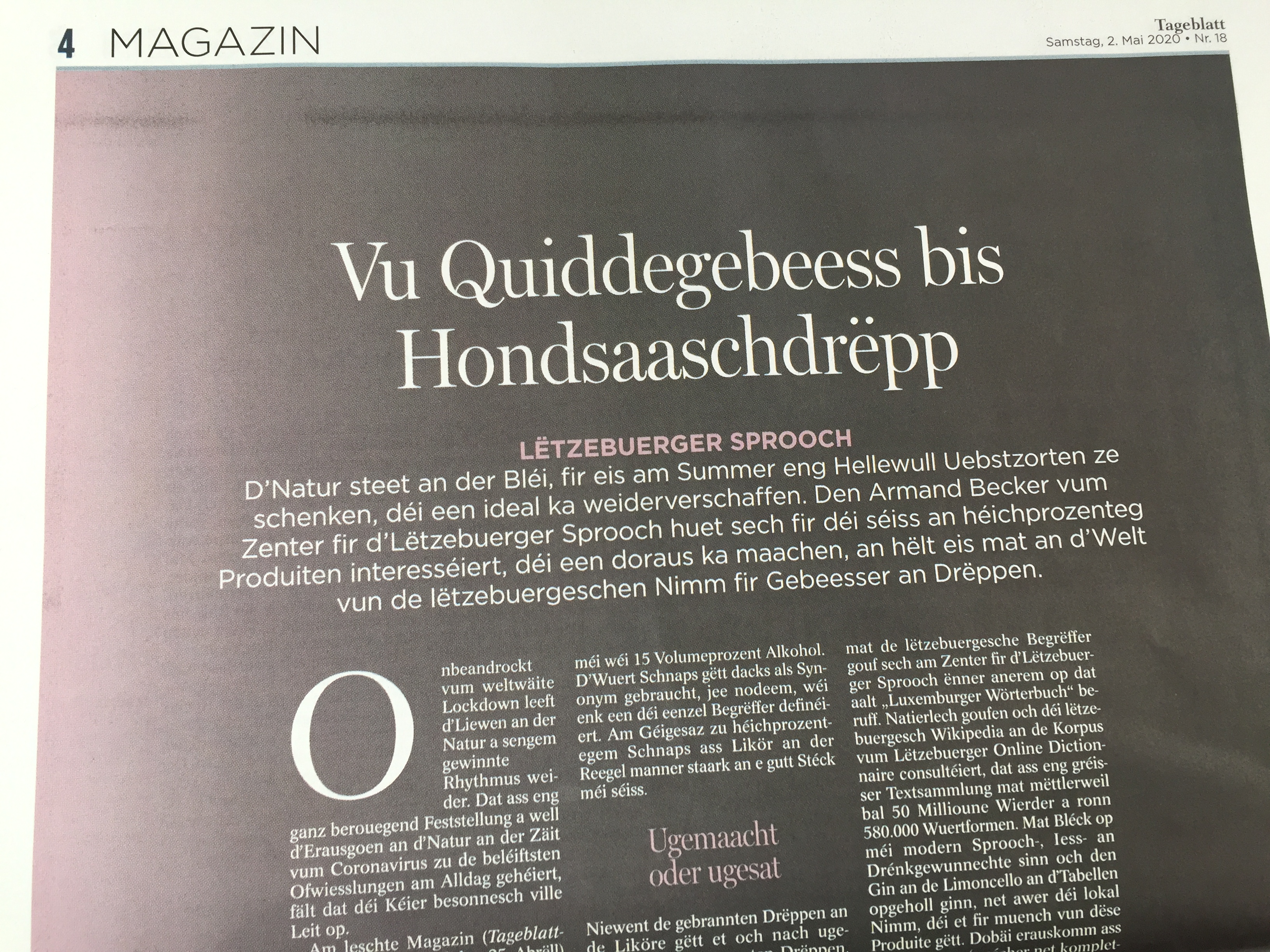 Ënner dem Motto „Luxembourgish to go“ huet d’Tageblatt sech zweemol samschdes a sengem Magazin-Deel mat der Lëtzebuerger Sprooch befaasst.