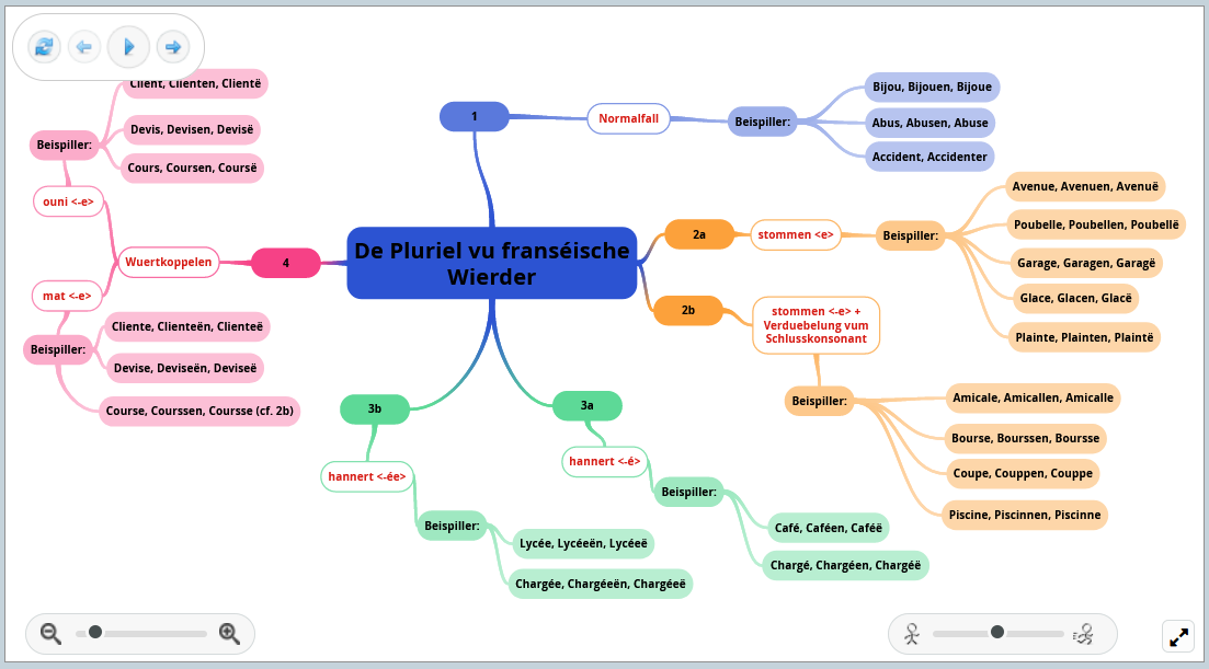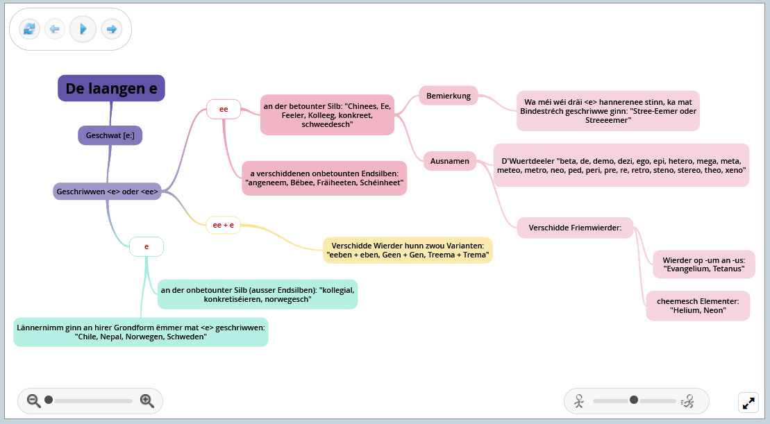 D'Mindmaps sinn dynamesch a bidden e ganz visuellen Zougang zu der Rechtschreiwung. Bis elo gëtt et der fir d'Vokalen, fir d'Vokalkoppelen, fir d'n- a fir d'r-Reegel, fir d'Ennverhäerdung a fir déi franséisch Pluriellen.