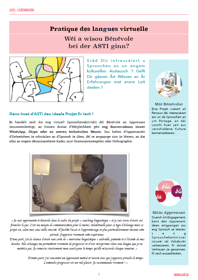 Déi virtuell Sproochenaktivitéit gëtt dem Benevollen an dem Apprenant d’Méiglechkeet, eng Konversatioun iwwer WhatsApp, Skype oder en aneren technesche Moyen ze féieren. Esou kréien d’Apprenanten d’Geleeënheet, ze schwätzen an d’Sprooch ze üben, déi se amgaange sinn ze léieren, an dat alles an engem decontractéierte Kader, ouni Grammairesreegelen an och ouni Orthografie. E kulturellen Austausch, bei deem ee Wëssen an Erfarungen deele kann.