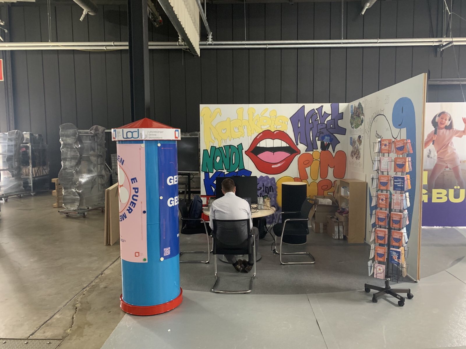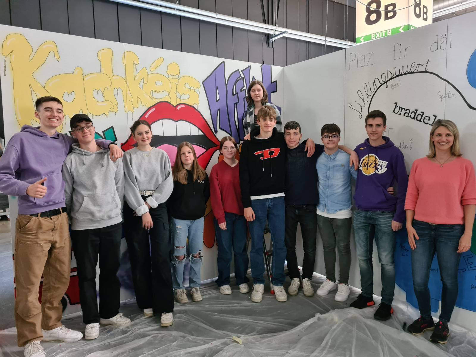 D'nächst Woch ass déi éischt Editioun vun der Schoulfoire YEP: Vum 2. bis de 4. Mee 2022 ass och den Zenter fir d'Lëtzebuerger Sprooch an der Luxexpo ze fannen – um Stand vum Ministère fir Educatioun, Kanner a Jugend an der Hal 8. Iwwersi kënnt Der eis net, well d'Optioun Graffiti vun den Troisièmen aus dem Iechternacher Lycée huet eis Maueren dekoréiert.