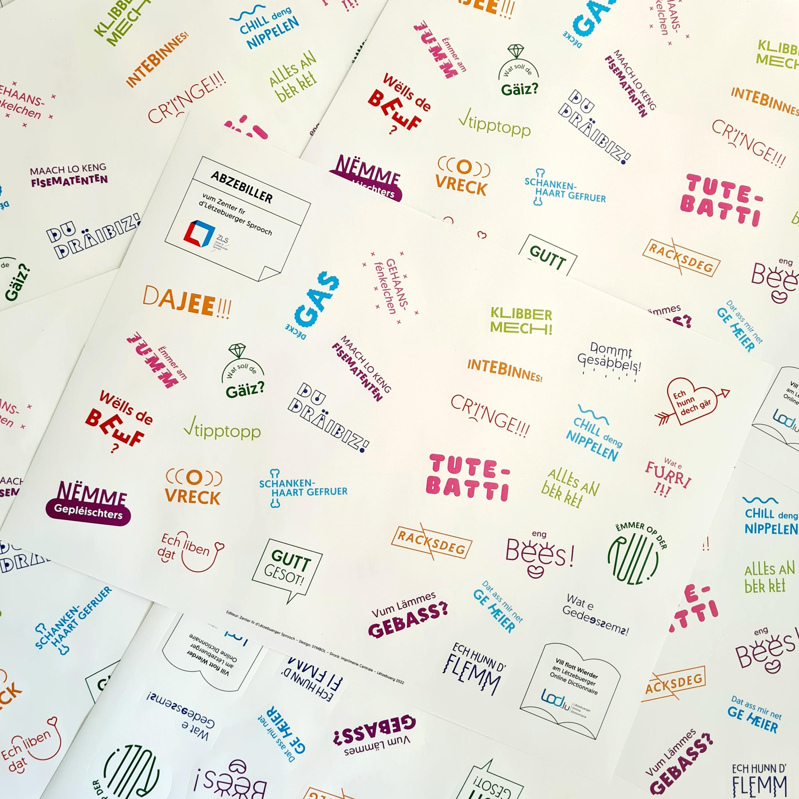 Wien eis op eisem Stand op der Schoulfoire besicht, dee ka sech do en A3-Blat mat 30 flotte lëtzebuergesche Spréch mathuelen – vun DAJEE bis ËMMER AM JUMM! Natierlech gratis! Designt goufe se vum Elisabeth Tescher vu SYMBOL. Avis aux amateurs!