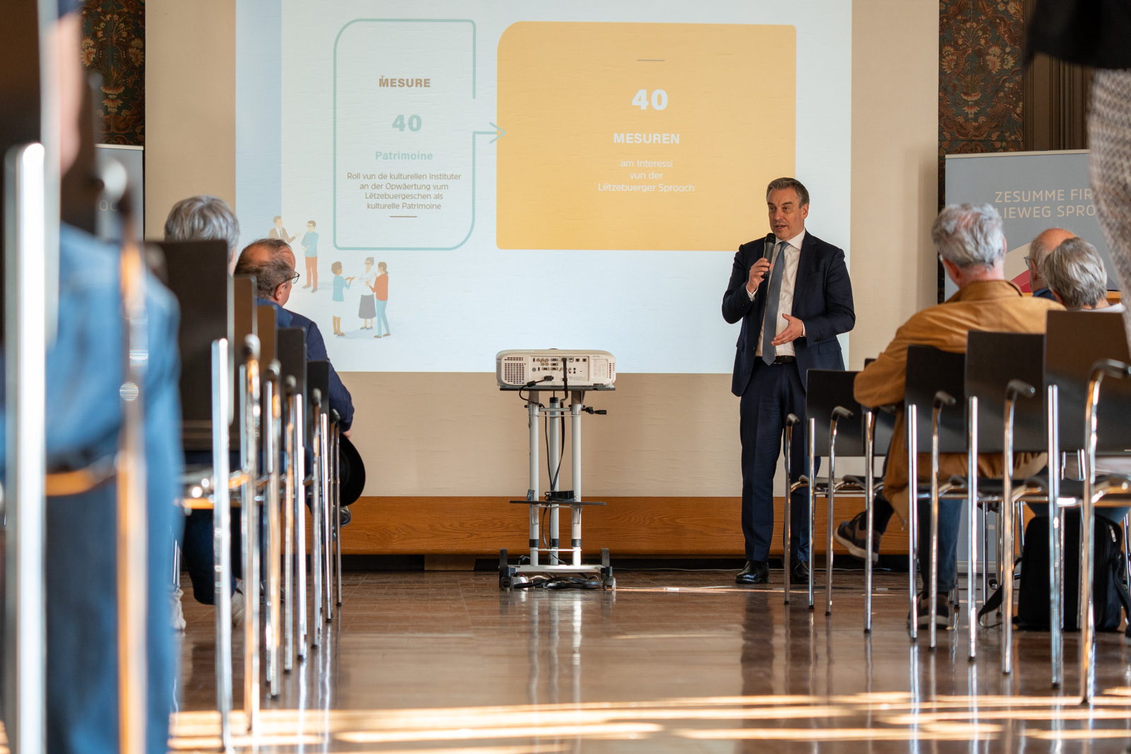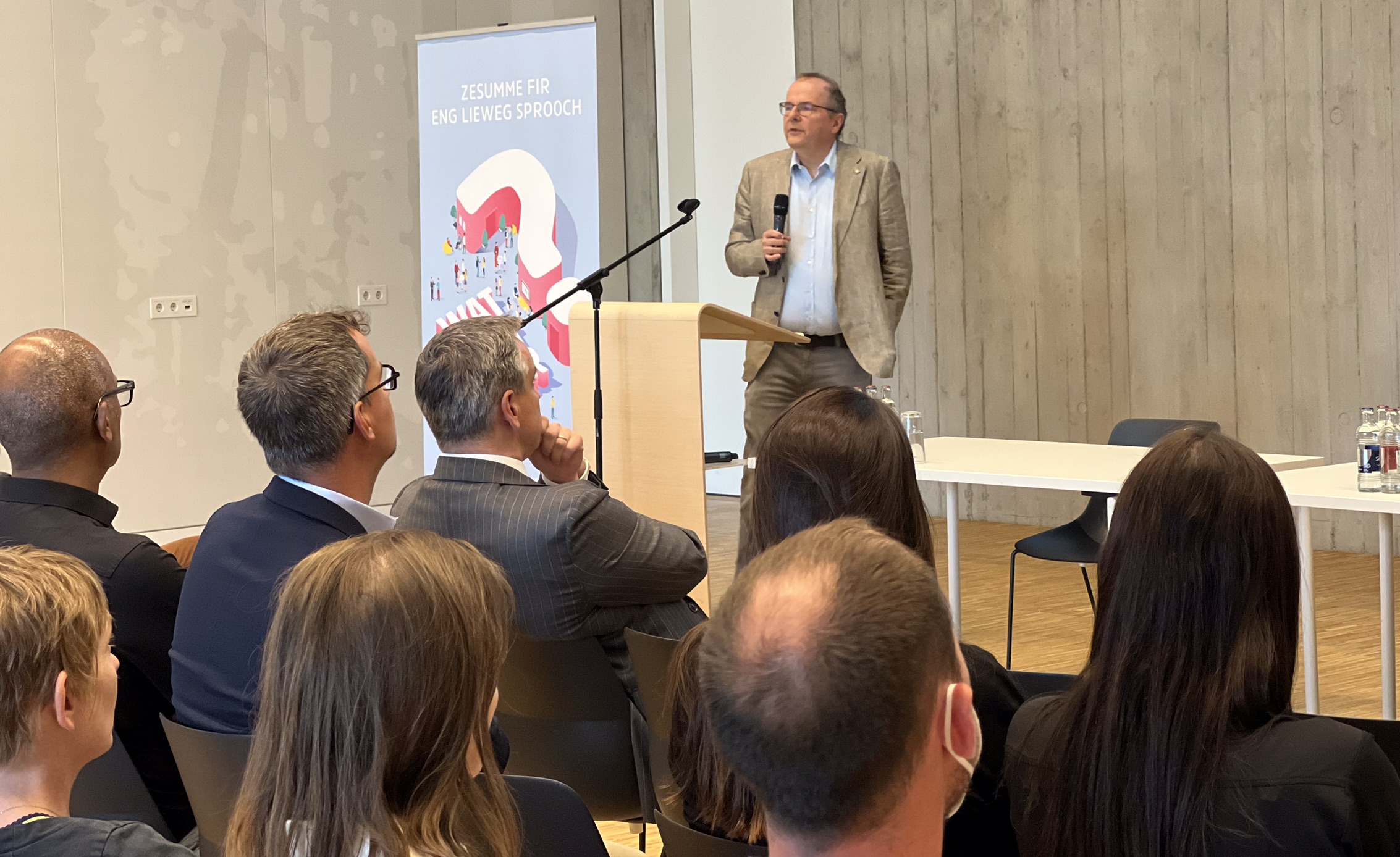 D’Sproocheronn 2022 mam Minister Claude Meisch, dem Commissaire Marc Barthelemy an dem Zenter fir d'Lëtzebuerger Sprooch gouf op véier Owenter a véier Regioune vum Land organiséiert an all Bierger war invitéiert, dohinnerzekommen, matzediskutéieren a Proposen ze maachen.