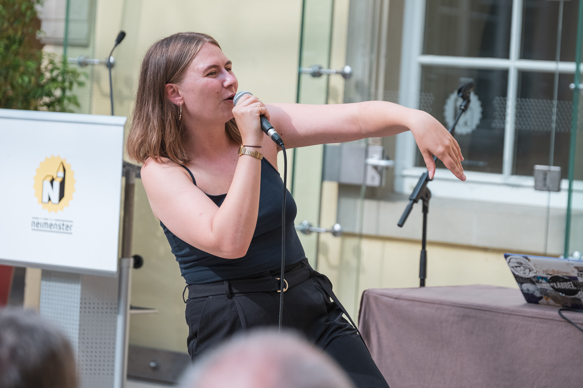 Musikalesch encadréiert gouf d’Virstellung vun der Wanderausstellung vun der lëtzebuergescher Hiphop-Kënschtlerin Nicool, déi de Public mat hire Lidder Stolz, Wonnerprächteg Rees an De Sonnden begeeschtert huet.