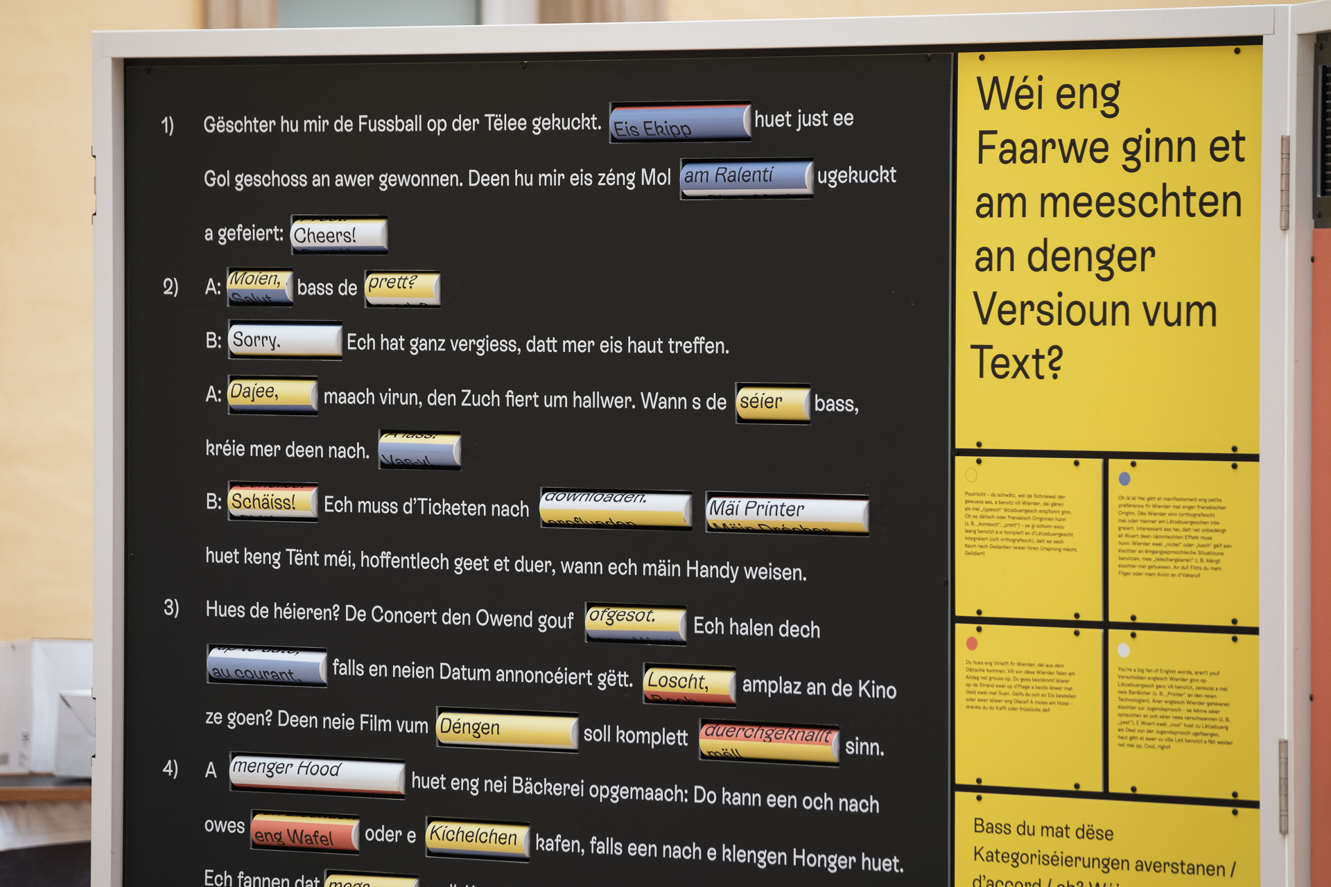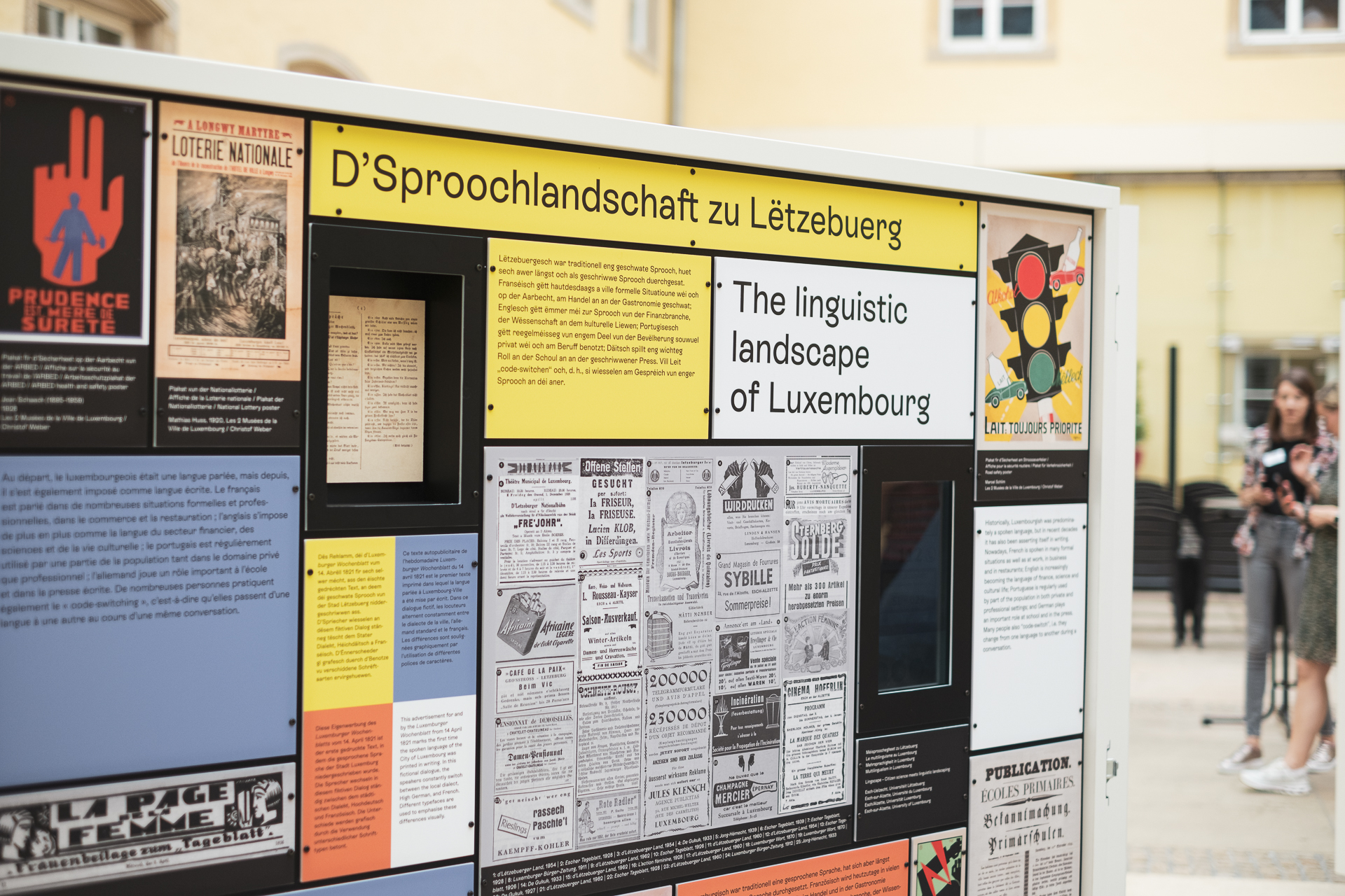D’Ausstellung „D’Lëtzebuerger Sprooch(en)“ versteet sech als Invitatioun, fir sech mat Sprooch a Sproochen auserneenzesetzen. Den Titel ass bewosst méideiteg a soll déi komplex Sproochesituatioun zu Lëtzebuerg erëmspigelen.