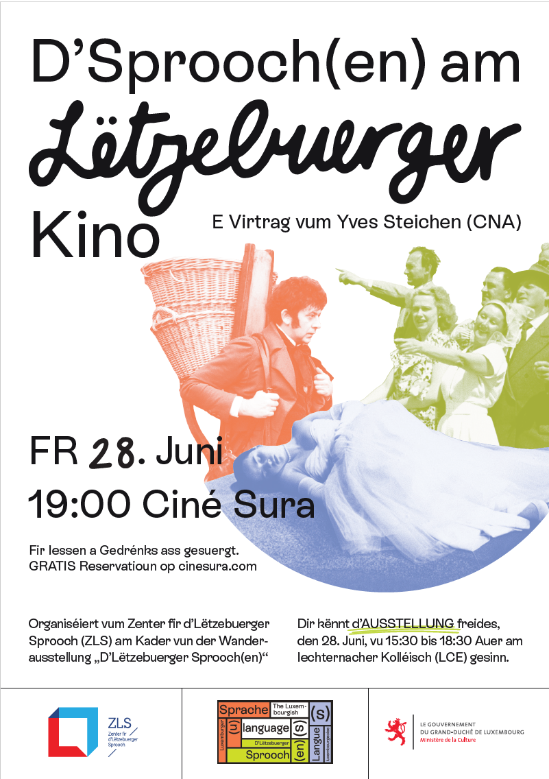 An deem Kontext organiséiere mir och e Virtrag iwwer „D’Sprooch(en) am Lëtzebuerger Kino“ zesumme mam Yves Steichen (CNA). De Virtrag fänkt um 19 Auer am Ciné Sura un. Virdru gëtt et nach eng Klengegkeet z'iessen an ze drénken.